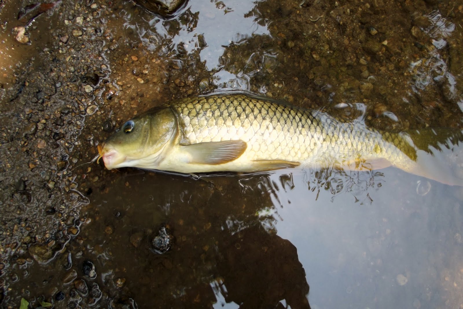 The Mysis Shrimp has been missing in action lately so it went on as an offering to the grand and golden ones. A lone carp was spotted; a cast... a unremarkable cast was made and fortunately fell lightly and within acceptable range of the creature. In watching the fish it was easy to see notice was taken. Attention turned to leader and then there it was... that ever-so subtle movement. Side sweep hook set and fish to hand. Picture taken, fish released, and the creek is left behind to another day.